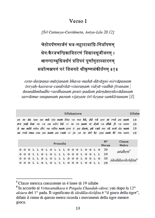 Testo sanscrito con caratteri devanagari, traslitterazione con caratteri diacritici, analisi metrica, analisi grammaticale, traduzione e spiegazione a cura di Varadarāja Dāsa