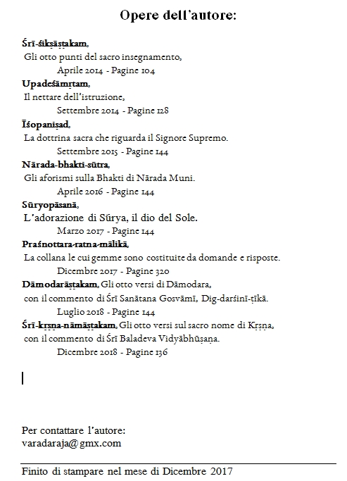 Testo sanscrito con caratteri devanagari, traslitterazione con caratteri diacritici, analisi metrica, analisi grammaticale, traduzione e spiegazione a cura di Varadarāja Dāsa